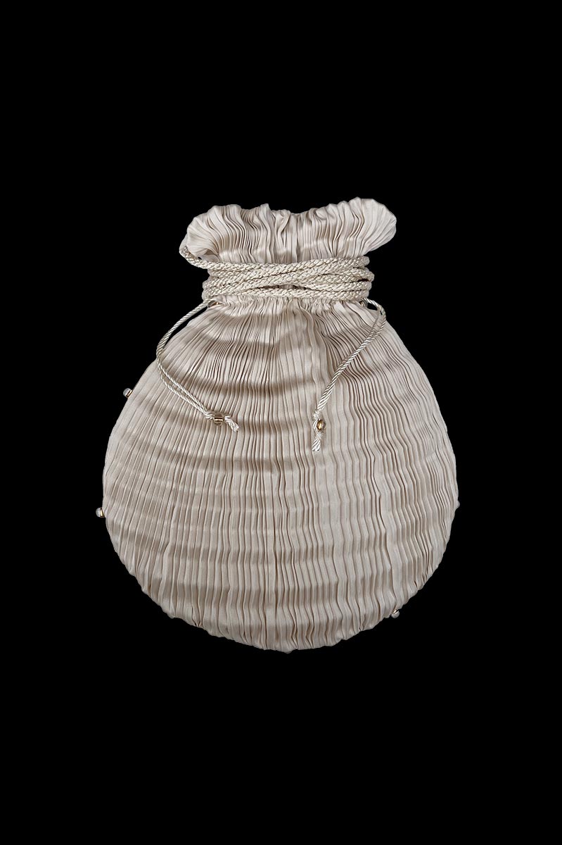 Echoing the signature Mariano Fortuny pleats, the Anthea bag is shaped from hand-pleated fabric and assembled with care in Venice. A drawstring closure and Murano glass beads add the final touch.