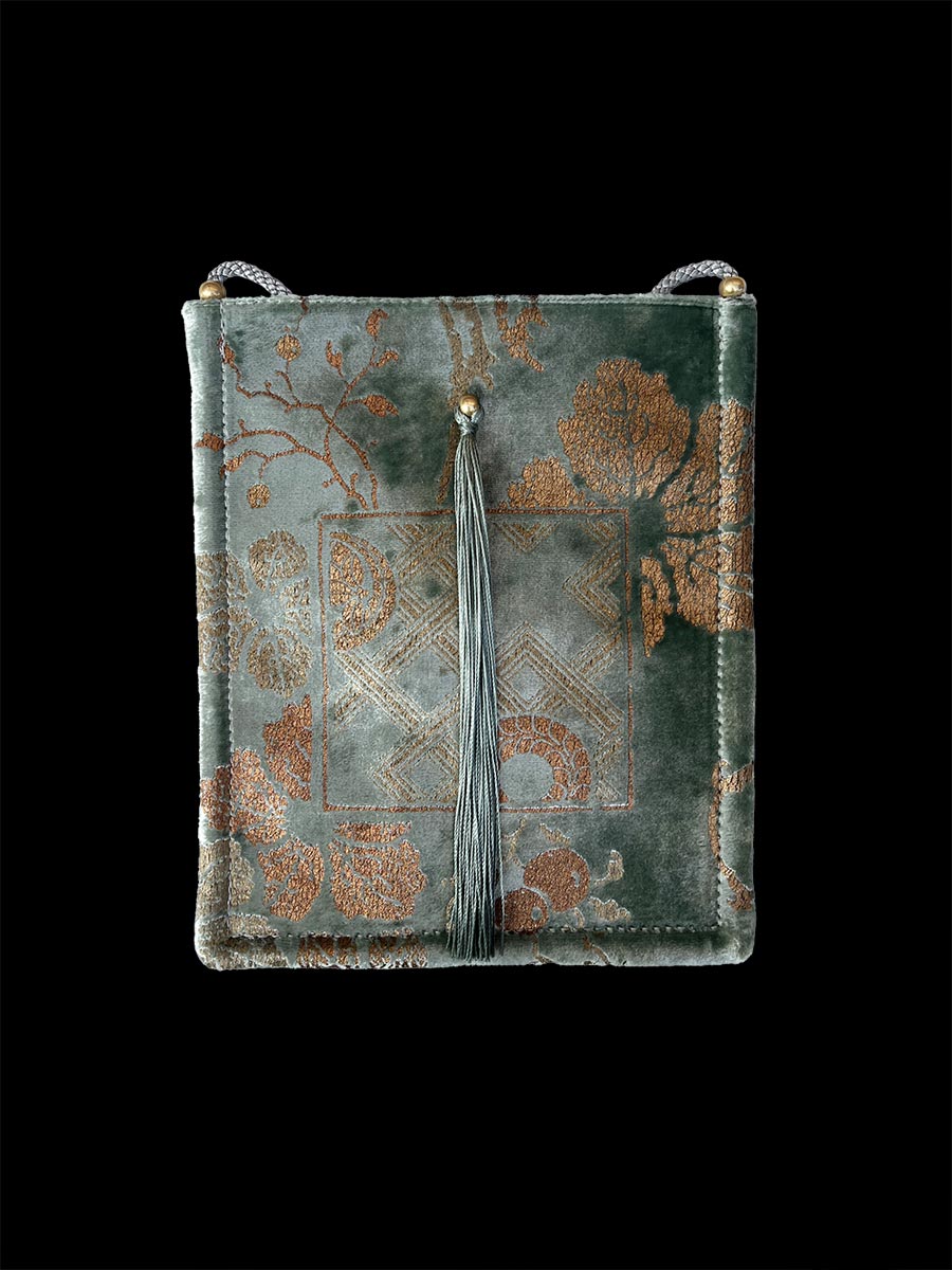 Cléo is a slim, flat pochette designed to hold the essentials with quiet elegance. Rectangular in shape and crafted in Venetian velvet, it is defined by its clean lines and soft texture, finished with a signature Fortuny tassel placed at the top. Lightweight and understated, Cléo is conceived as a discreet companion, designed to slip easily under the arm or be carried by hand.