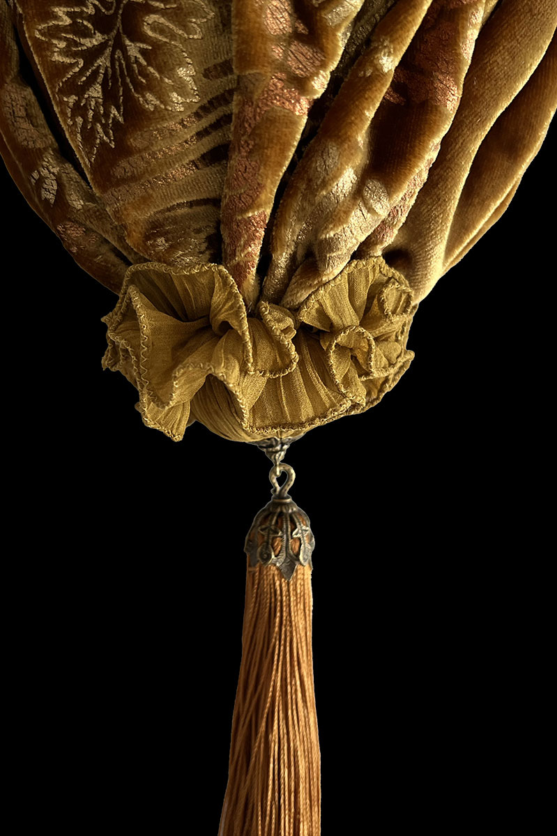Athena is a spherical hand-printed velvet handbag embellished with a decorative tassel.