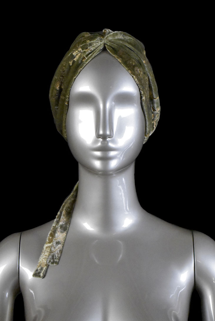 The turban is based on Mariano Fortuny’s style and techniques.