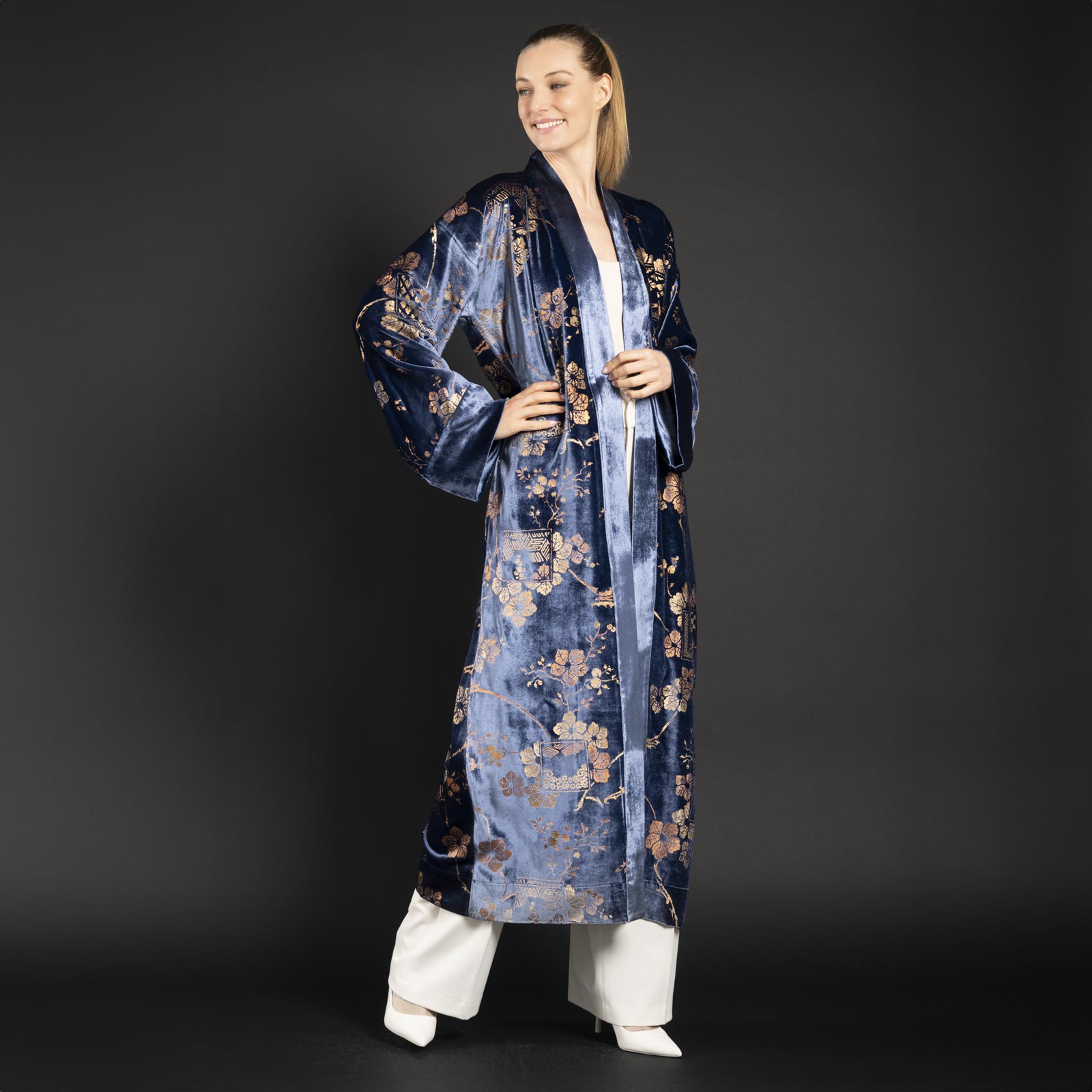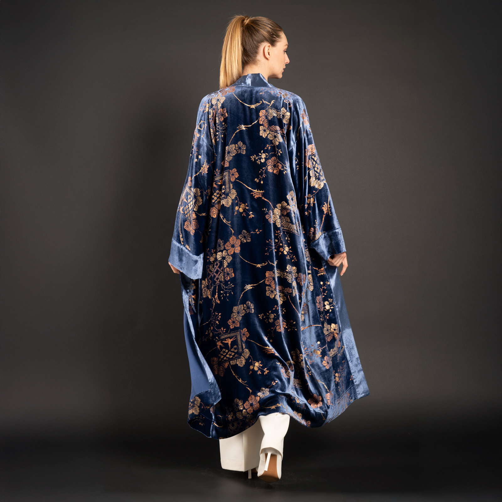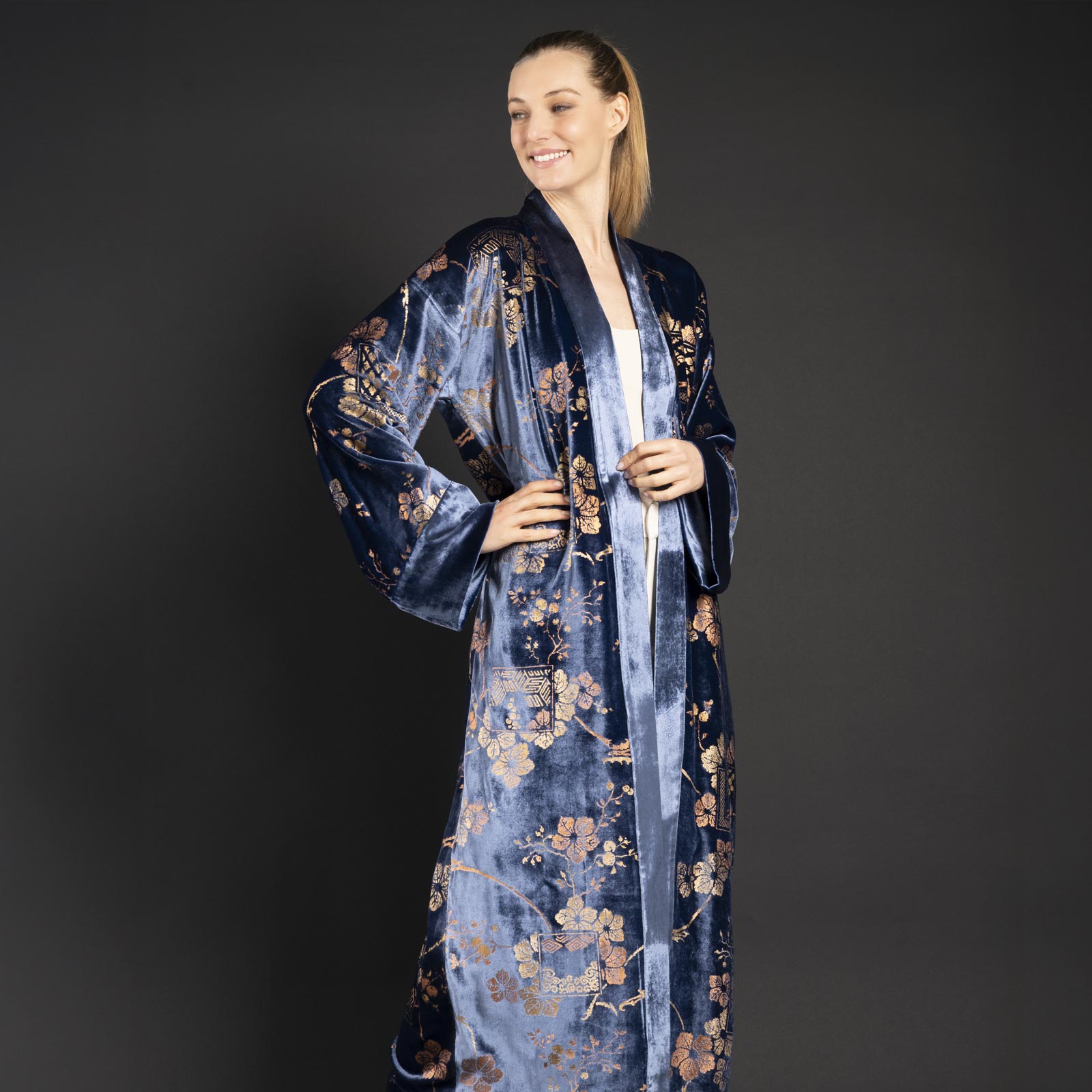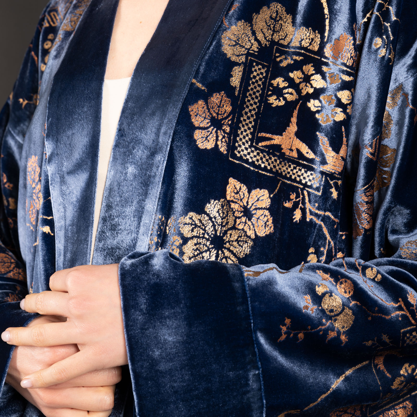 This long printed velvet kimono coat is based on Mariano Fortuny’s style and techniques.
