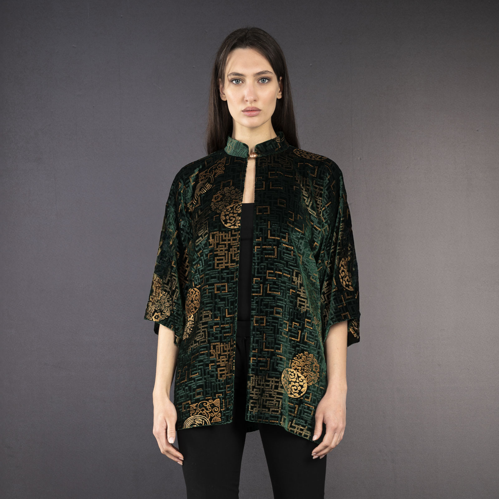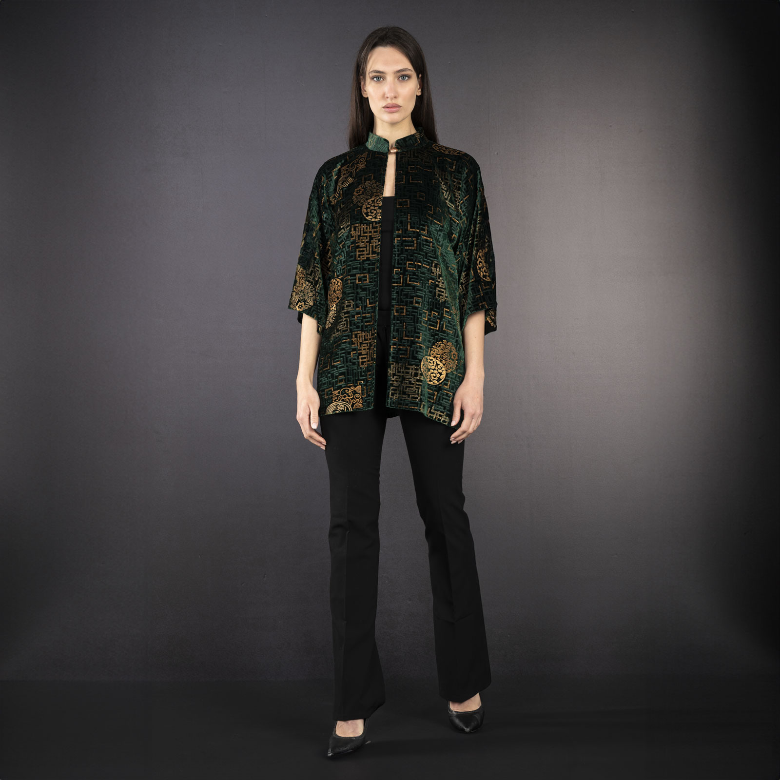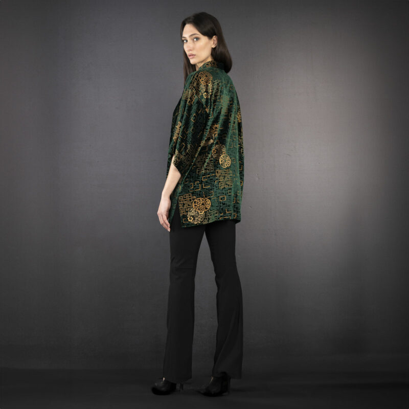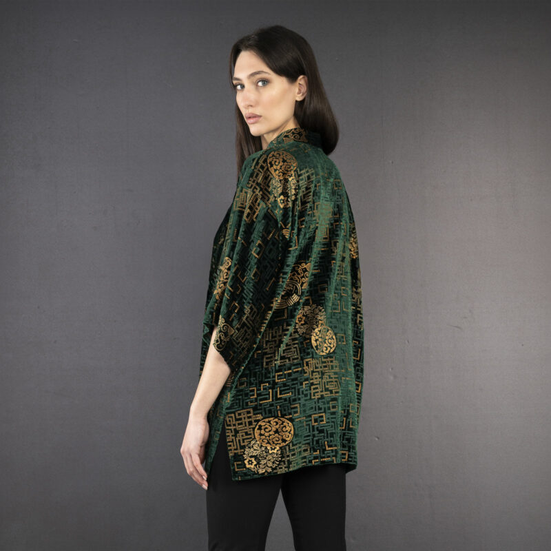 Be the first to review “Cecilia | Printed velvet Mandarin Collar Jacket | Kyoto Fir green”