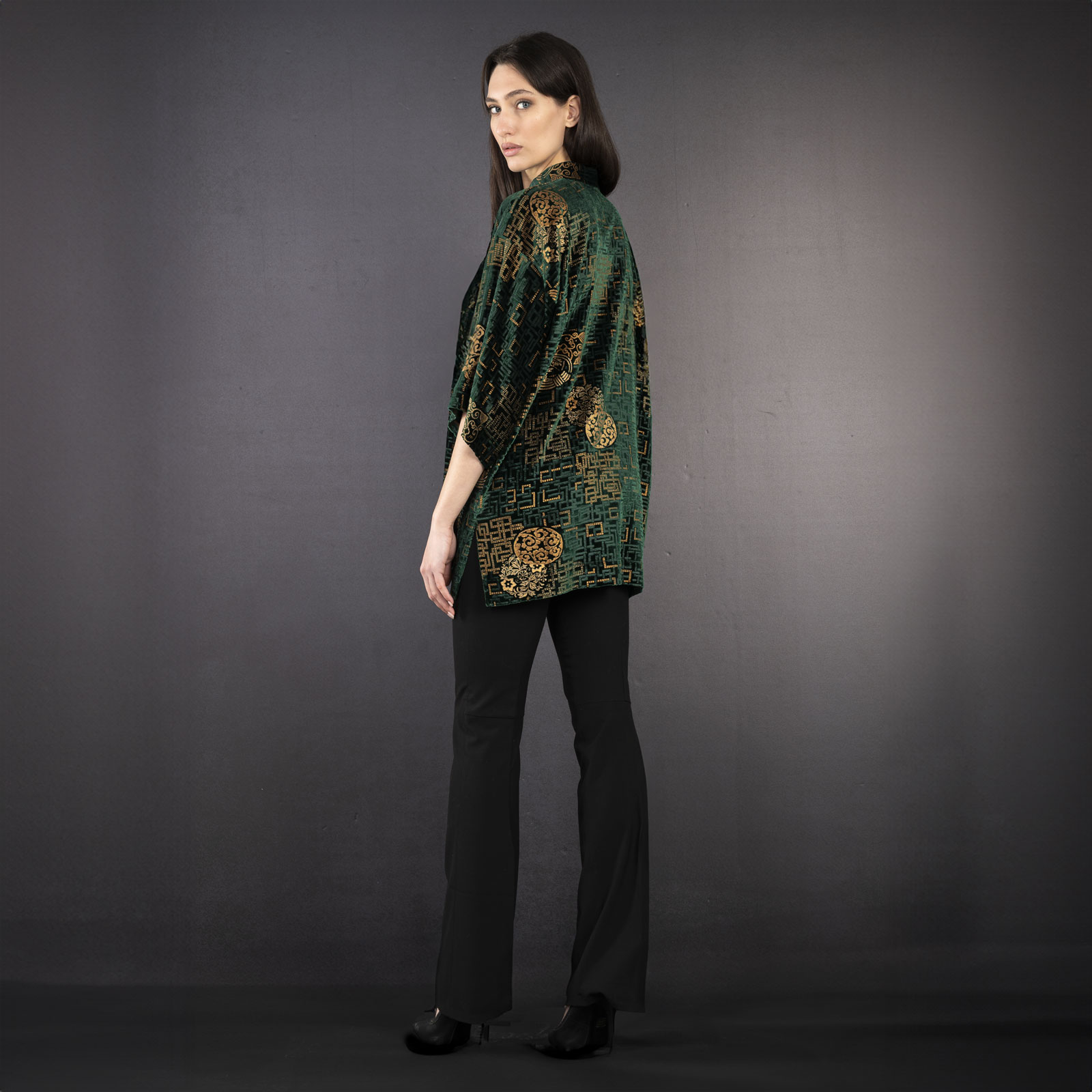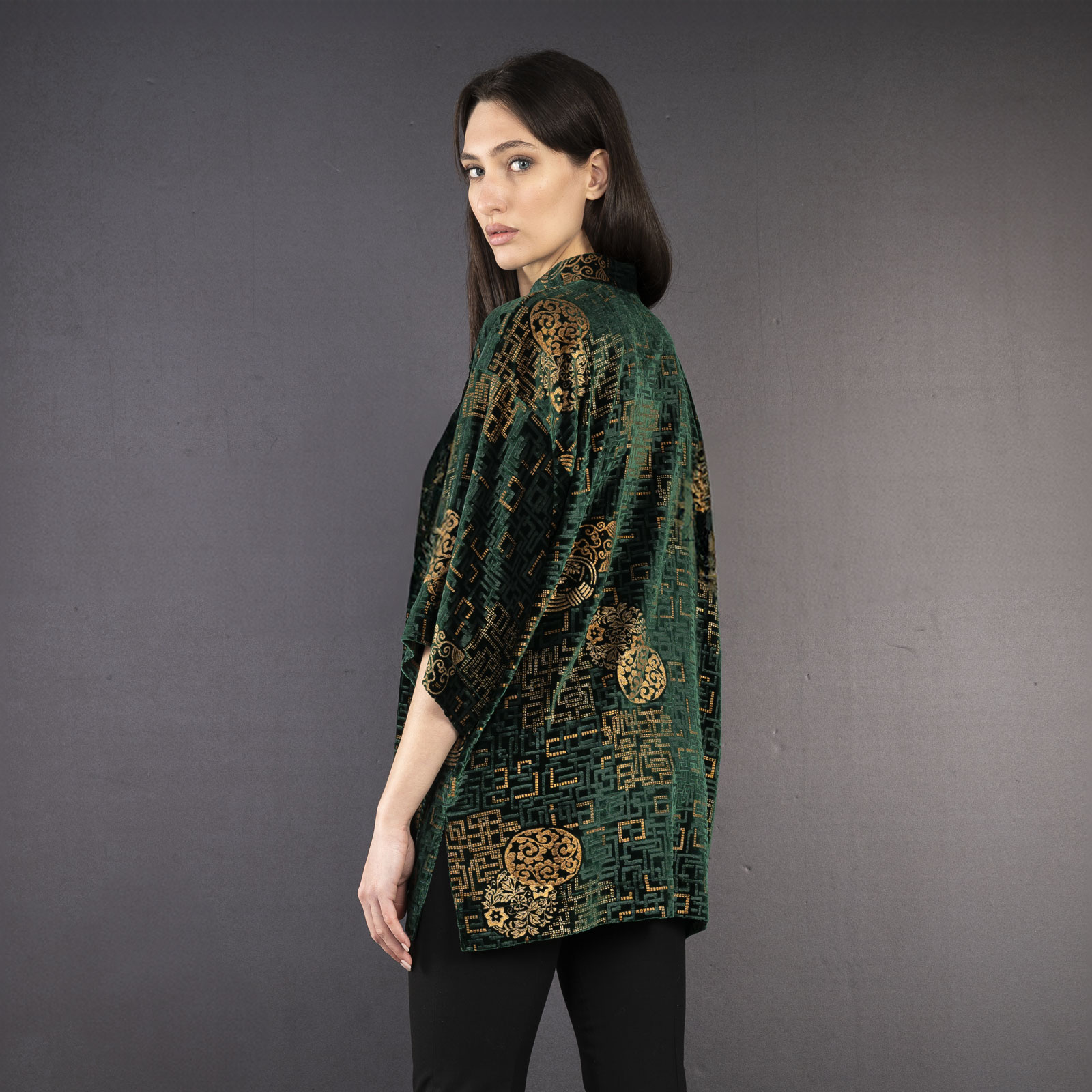 Soft velvets are used for elegant kimonos. The vibrant colors vary from sophisticated tone on tone combinations, to delicate pastel colors & bold shades such as reds or blacks. This kimono is hand printed with metal in Venice, color may differ slightly from the picture.