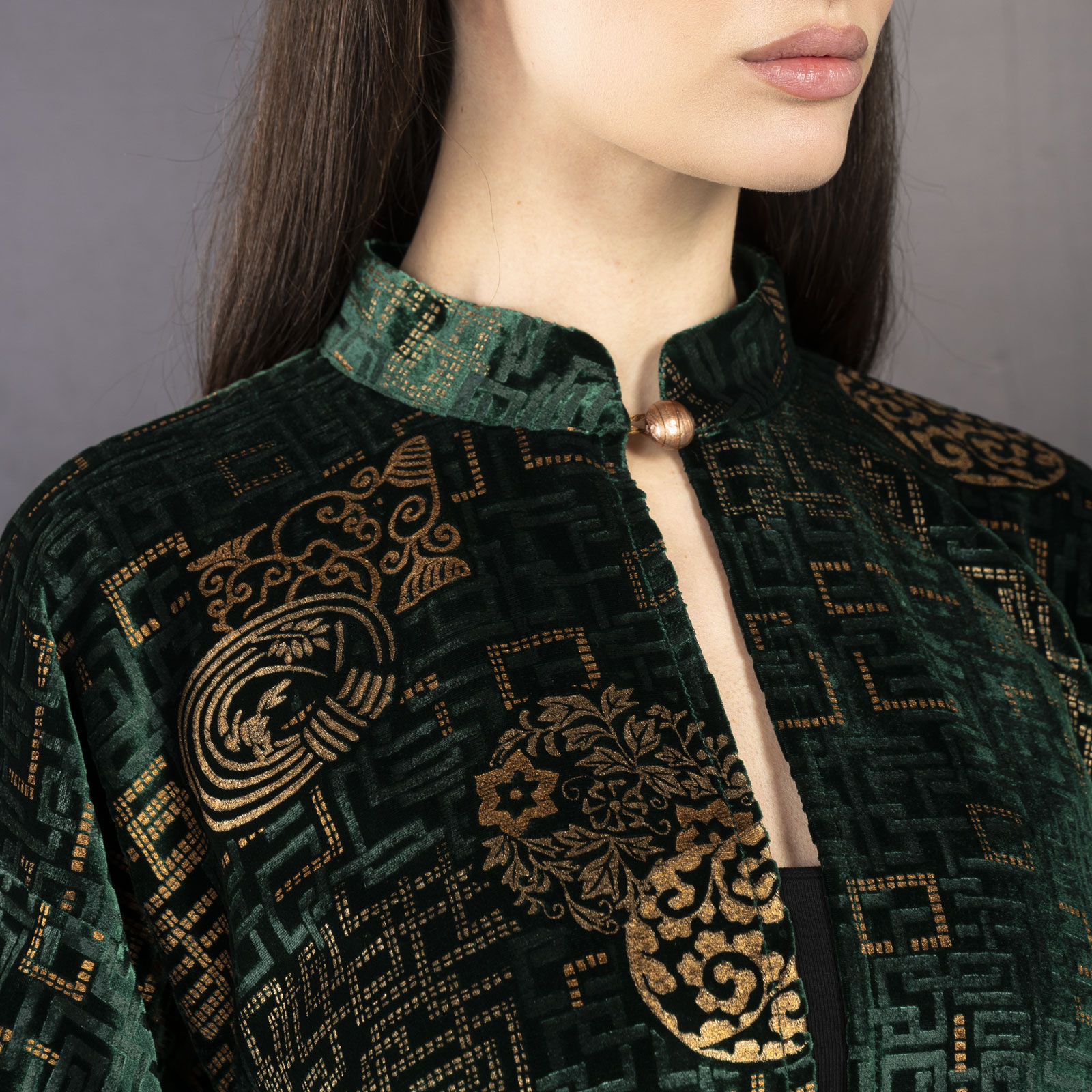 Cecilia | Printed velvet Mandarin Collar Jacket | Kyoto Fir green