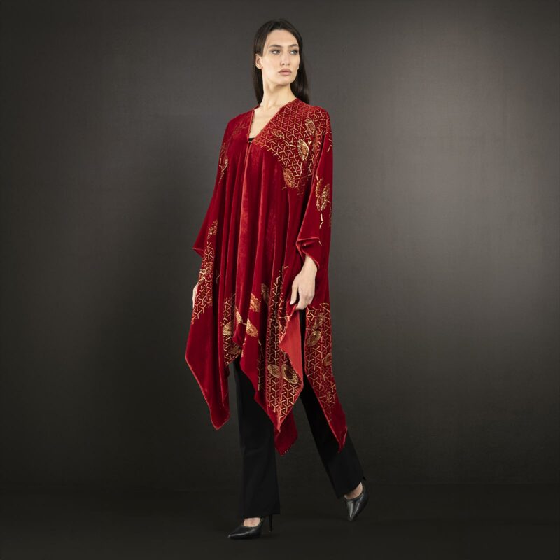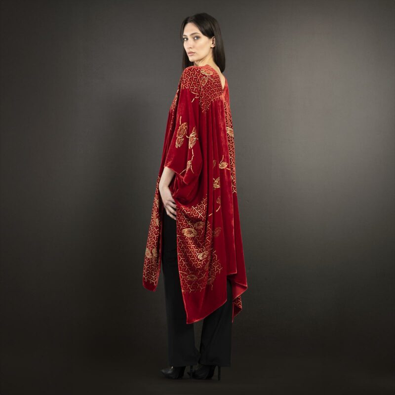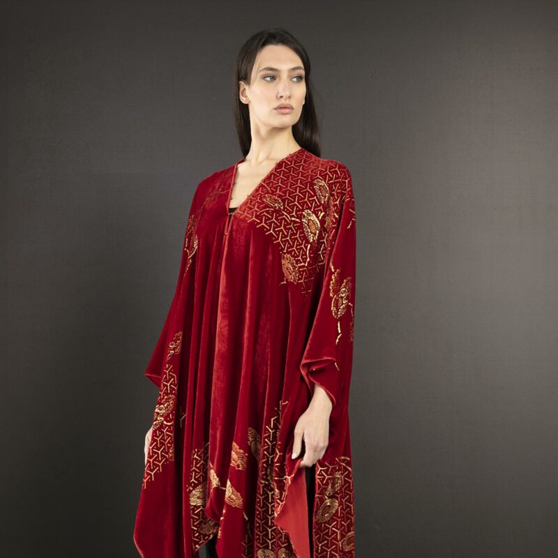 Be the first to review “Daphne | Printed velvet Long evening coat | Japan Red”