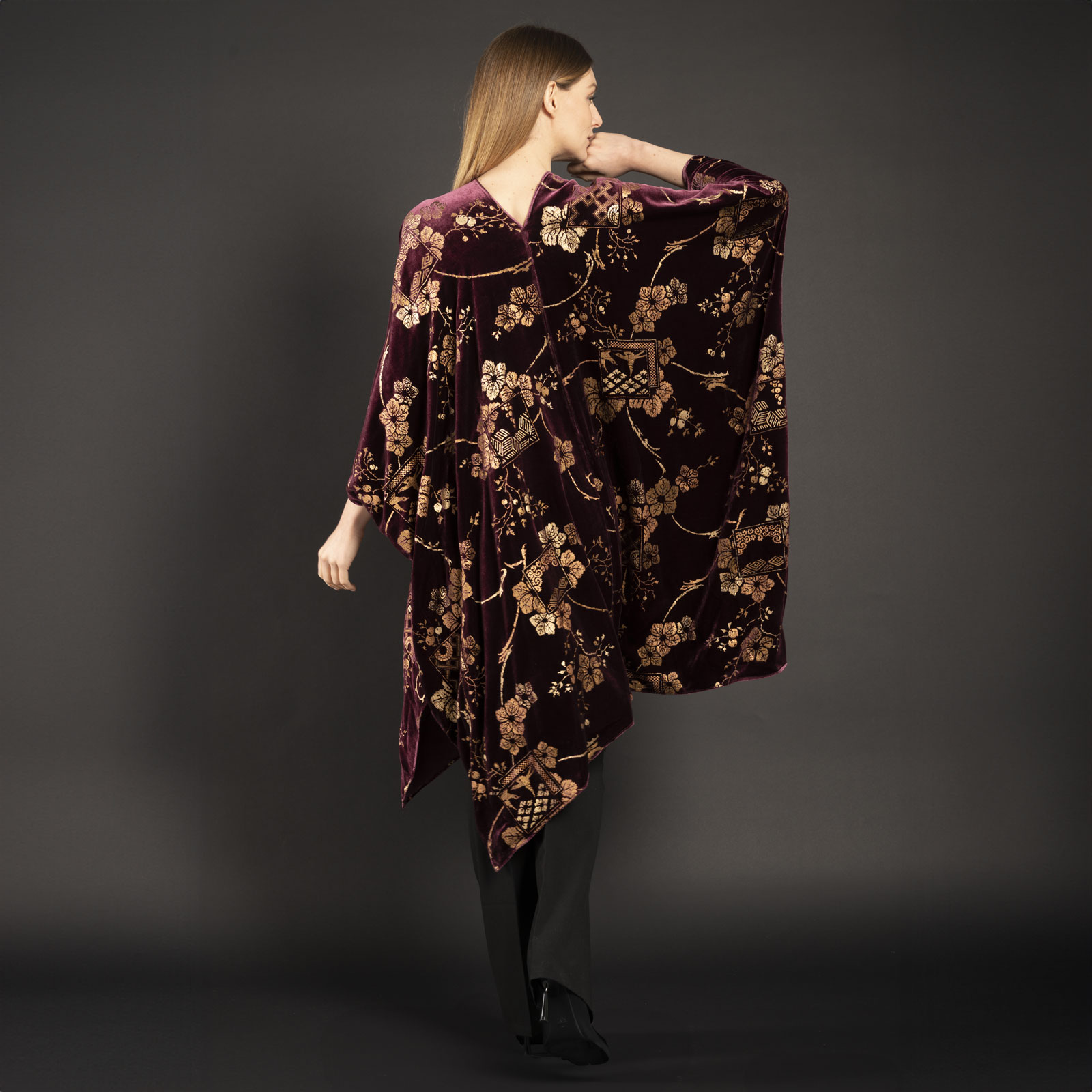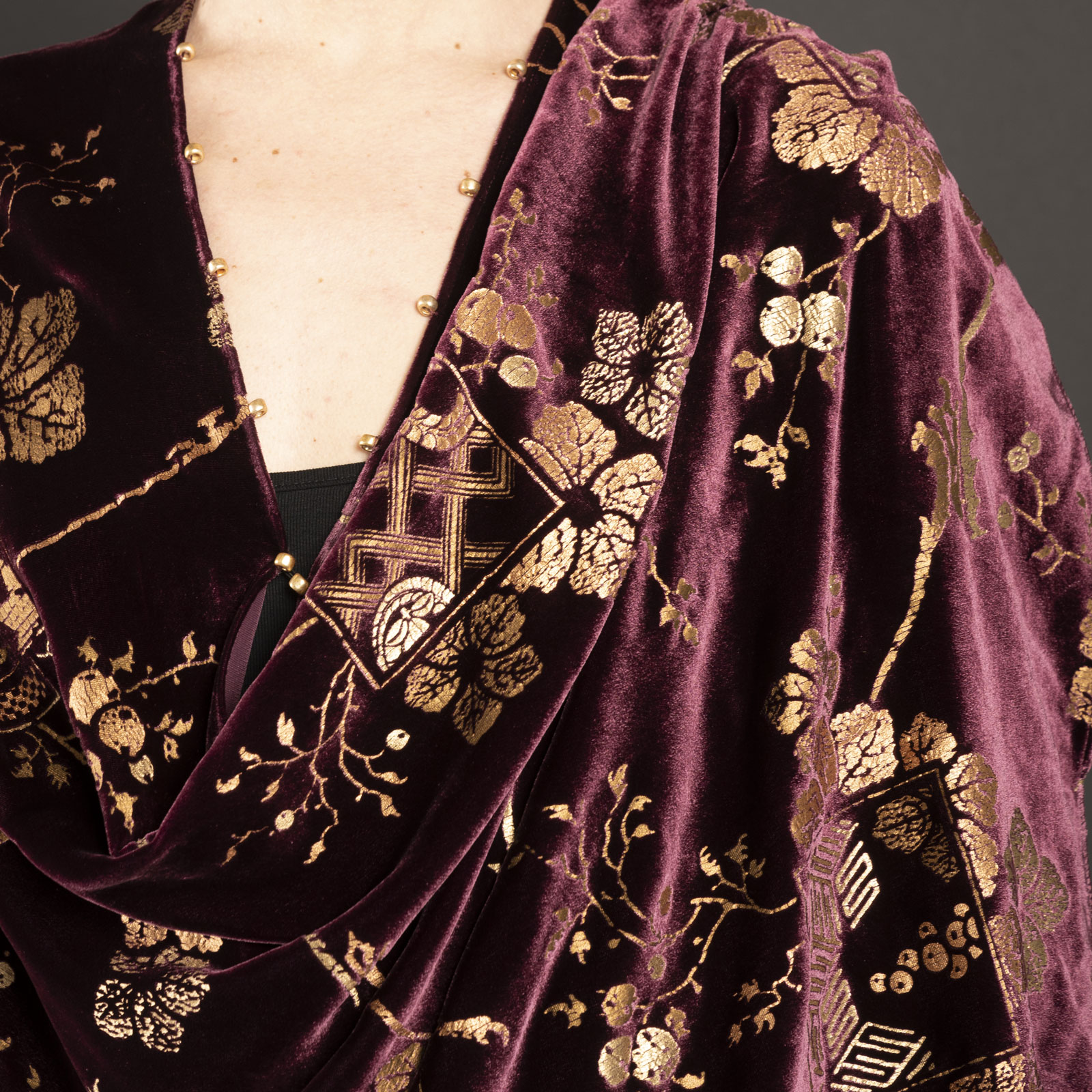 This short printed velvet evening wrap is based on Mariano Fortuny’s style and techniques.