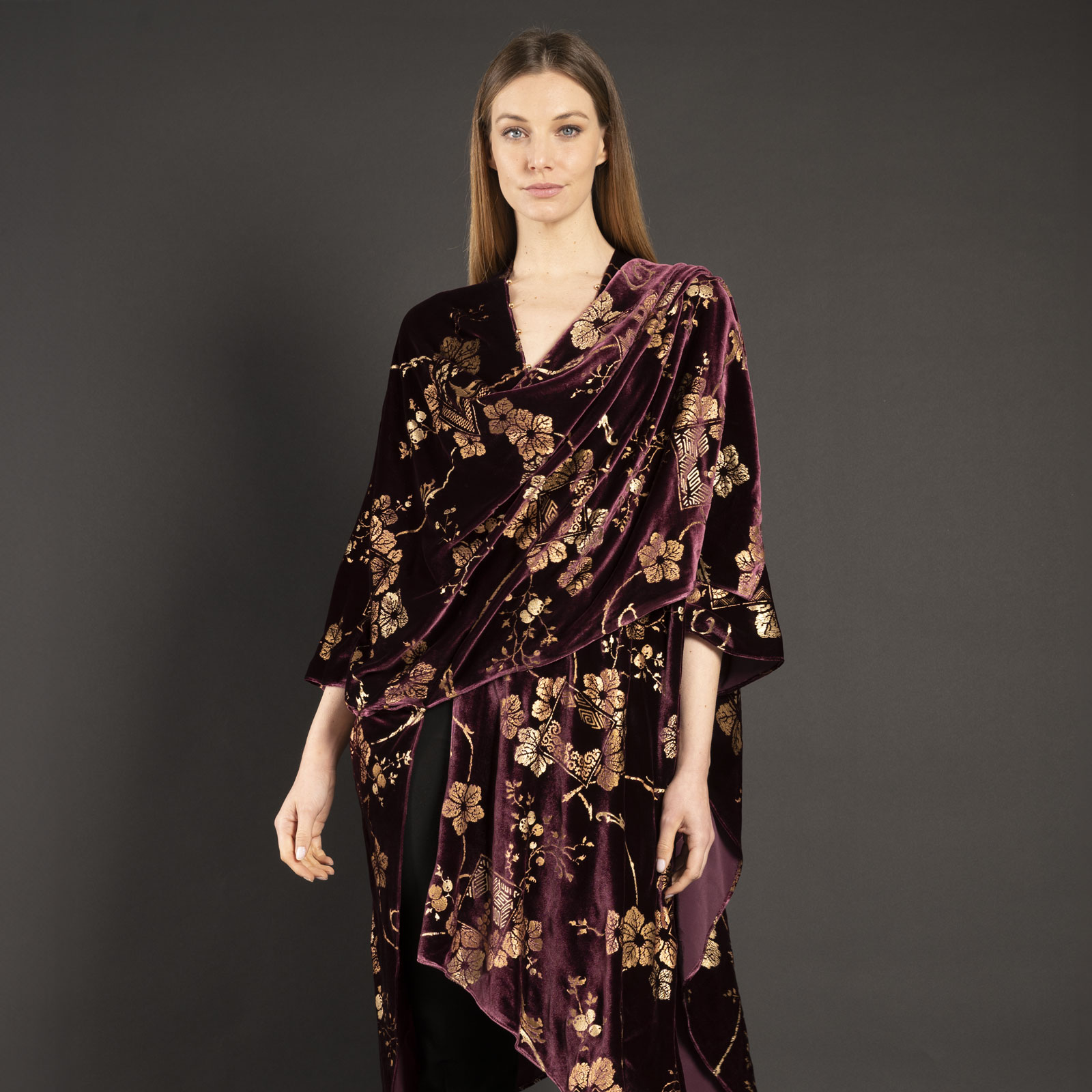 Soft velvets are used for elegant evening wraps. The vibrant colors vary from sophisticated tone on tone combinations, to delicate pastel colors & bold shades such as reds or blacks. This wrap is hand printed with metal in Venice, color may differ slightly from the picture.