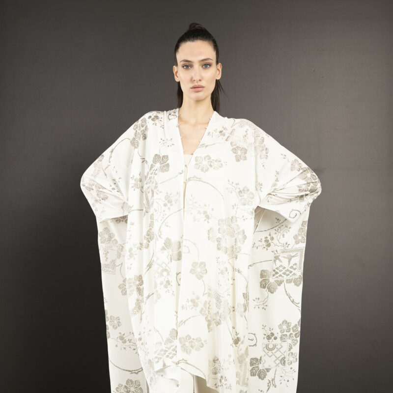 This short printed velvet evening wrap is based on Mariano Fortuny’s style and techniques.