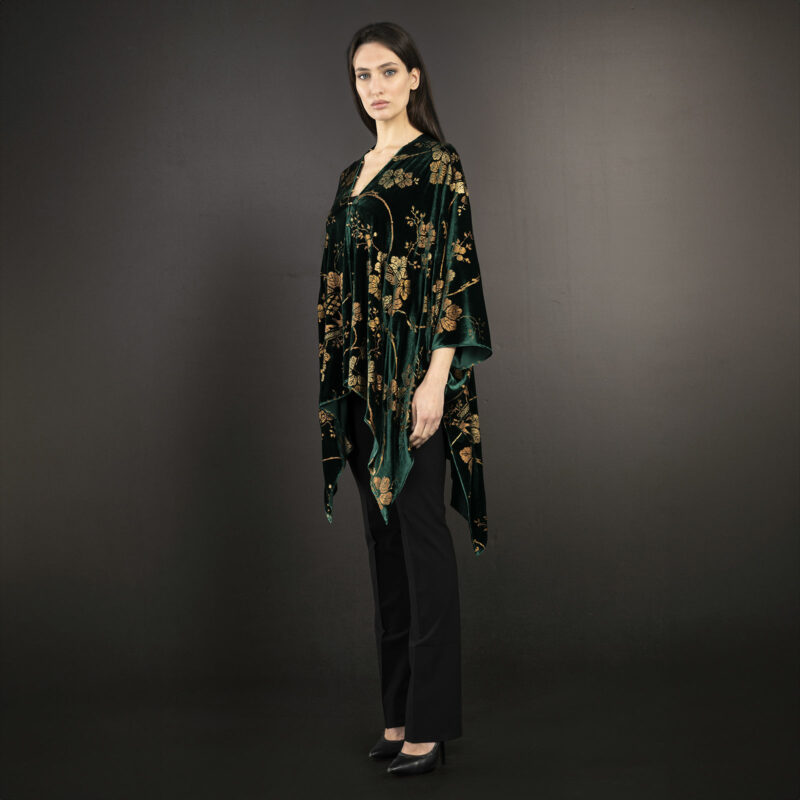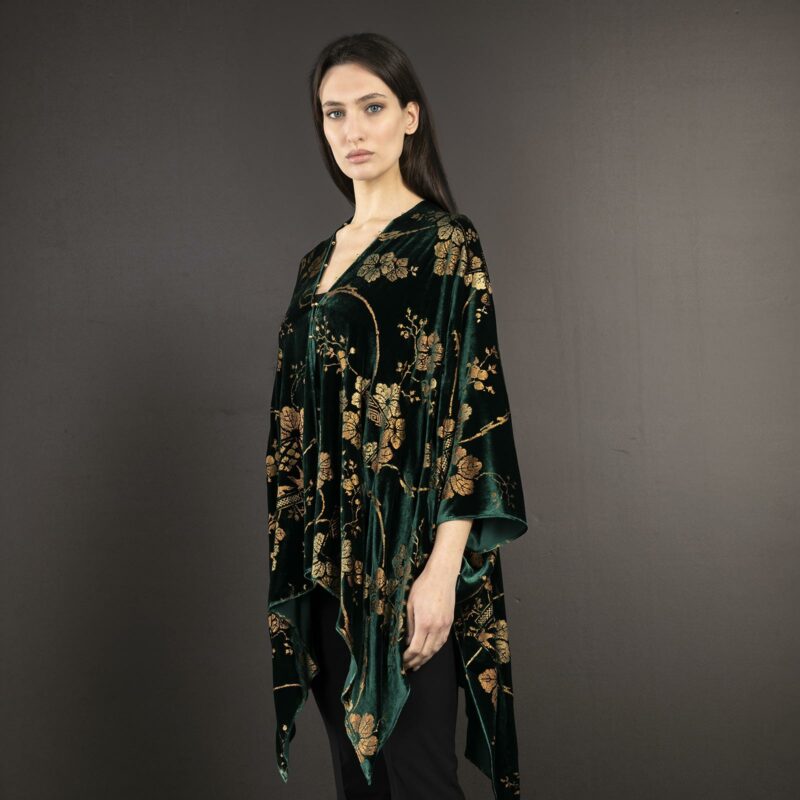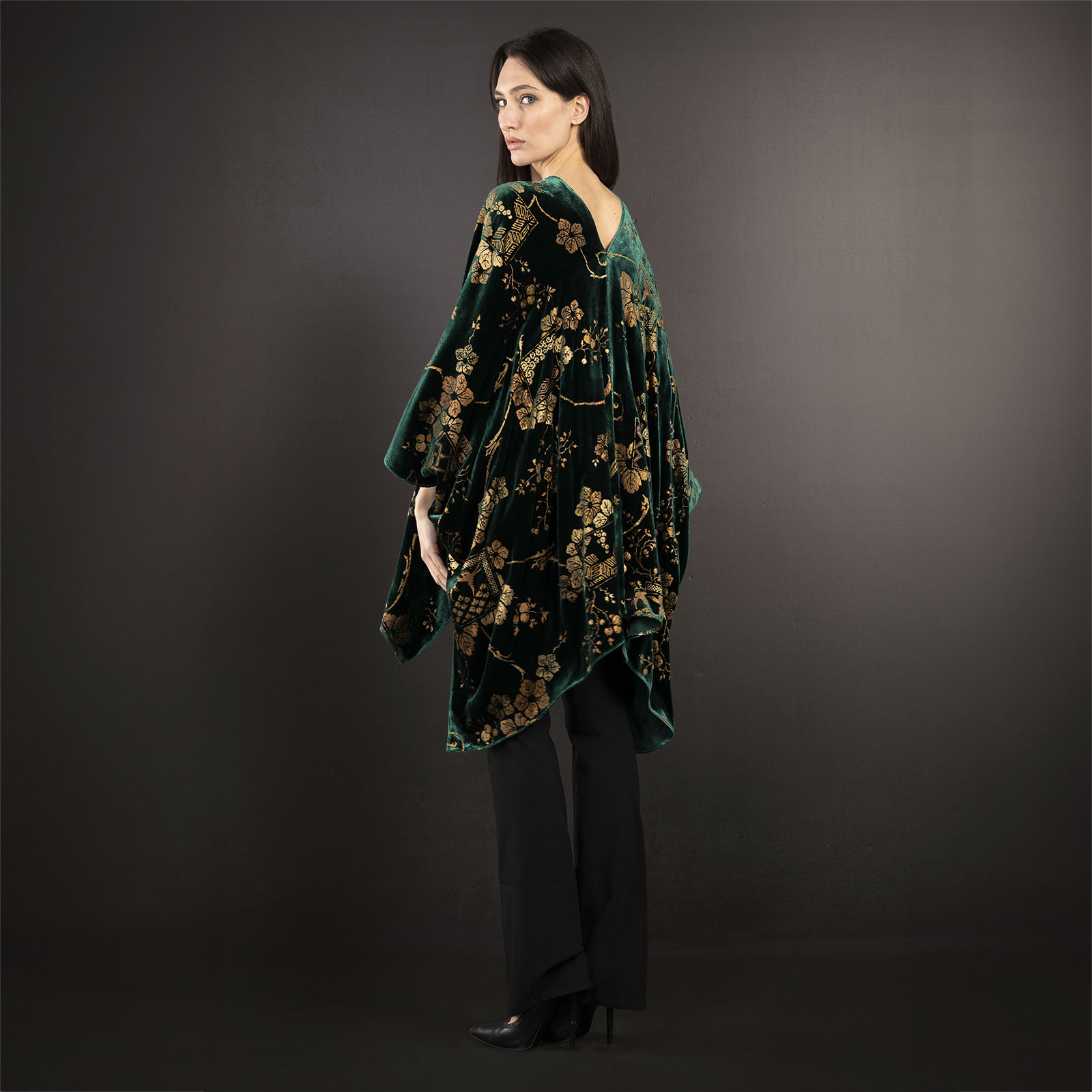 Soft velvets are used for elegant evening wraps. The vibrant colors vary from sophisticated tone on tone combinations, to delicate pastel colors & bold shades such as reds or blacks. This wrap is hand printed with metal in Venice, color may differ slightly from the picture.