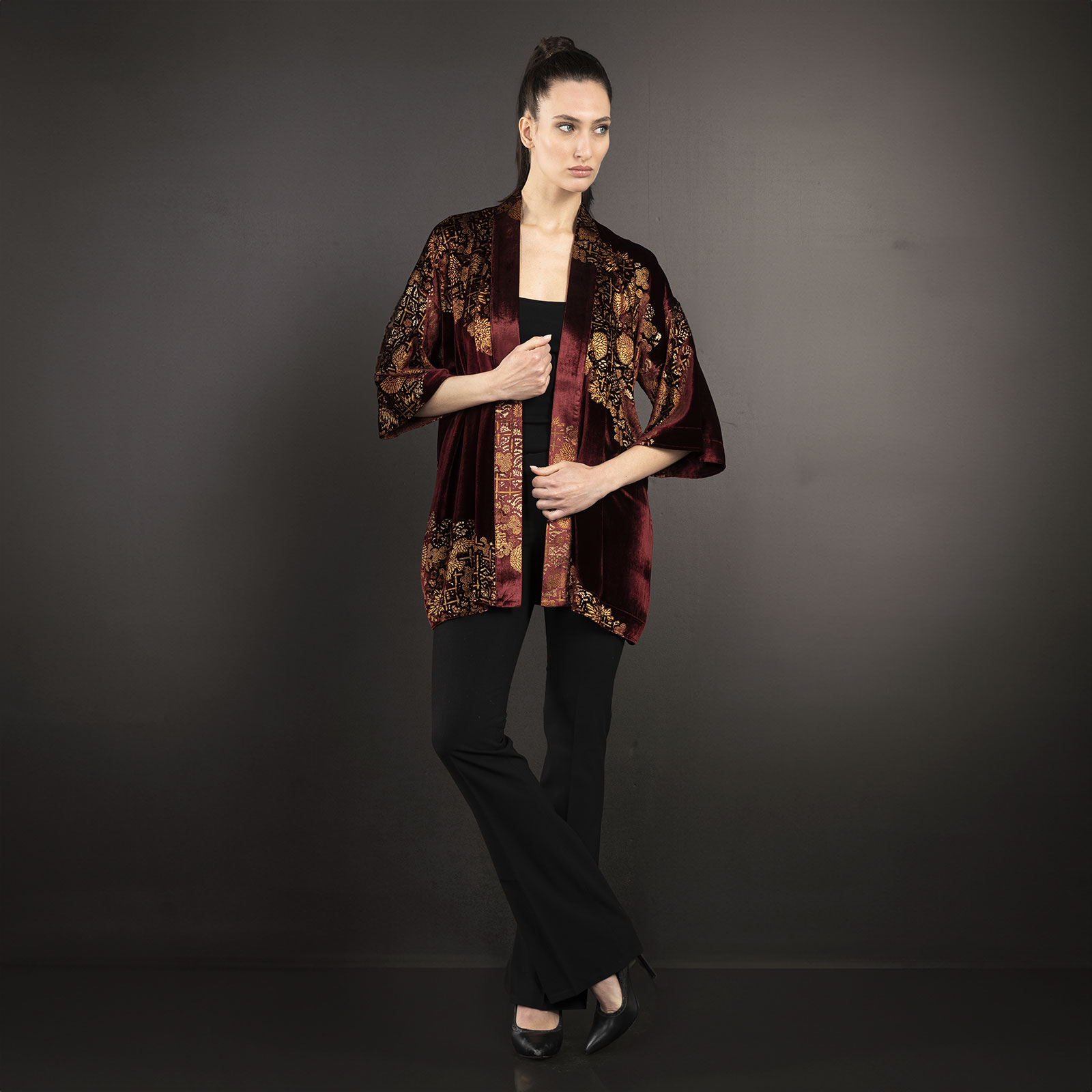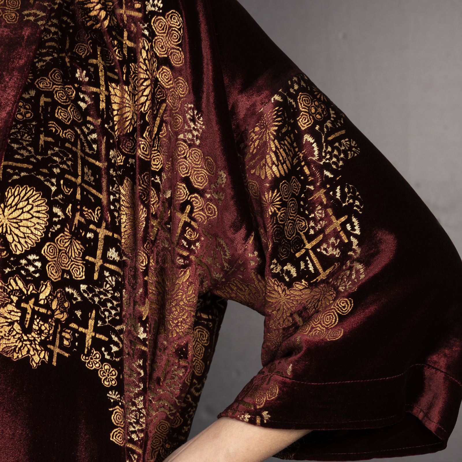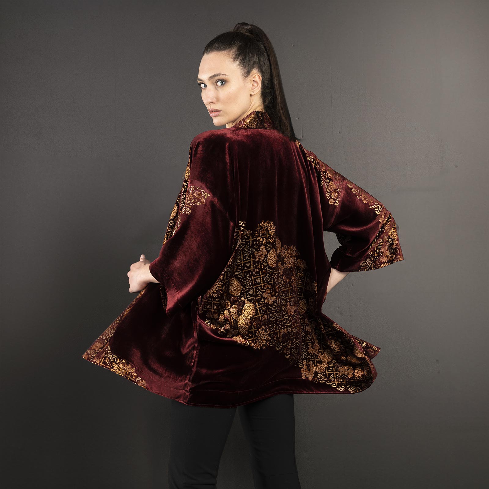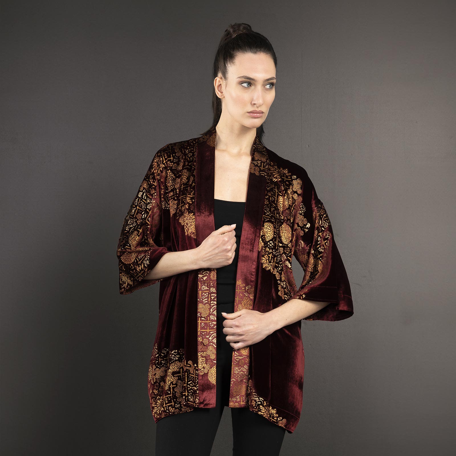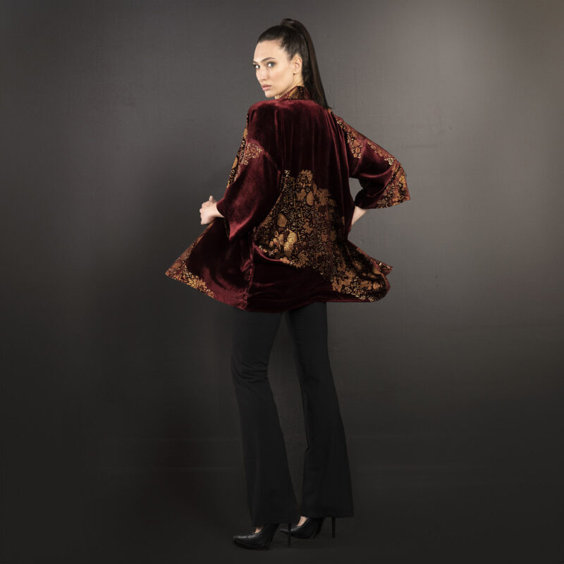 Be the first to review “Iris | Printed velvet Short kimono Coat | Crisantemi Bordeaux”