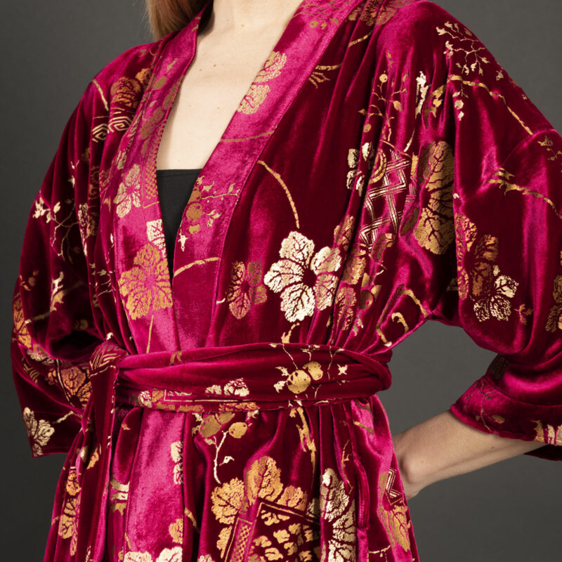 Soft velvets are used for elegant kimonos. The vibrant colors vary from sophisticated tone on tone combinations, to delicate pastel colors & bold shades such as reds or blacks. This kimono is hand printed with metal in Venice, color may differ slightly from the picture.