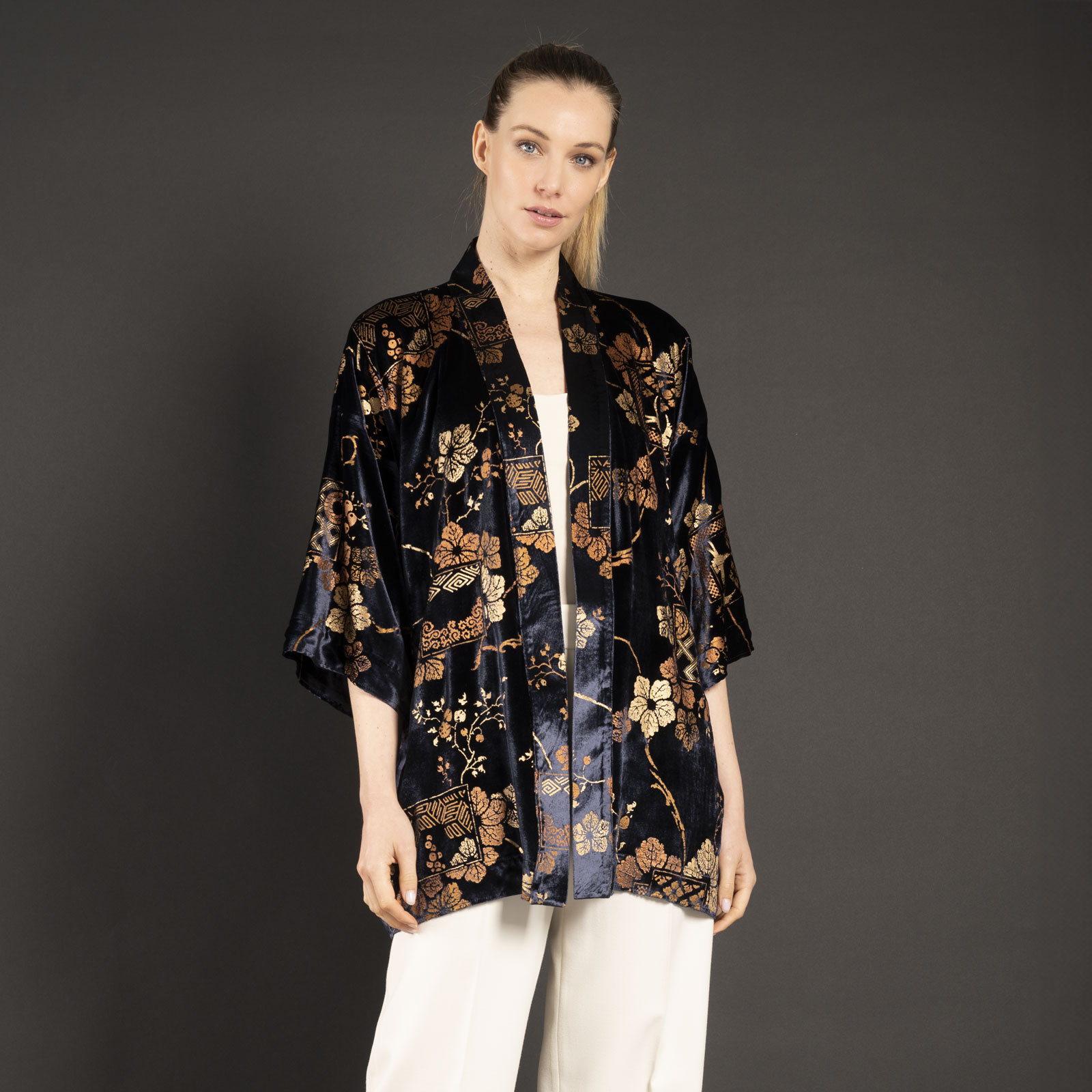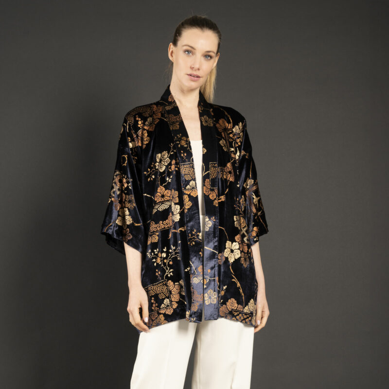Soft velvets are used for elegant kimonos. The vibrant colors vary from sophisticated tone on tone combinations, to delicate pastel colors & bold shades such as reds or blacks. This kimono is hand printed with metal in Venice, color may differ slightly from the picture.