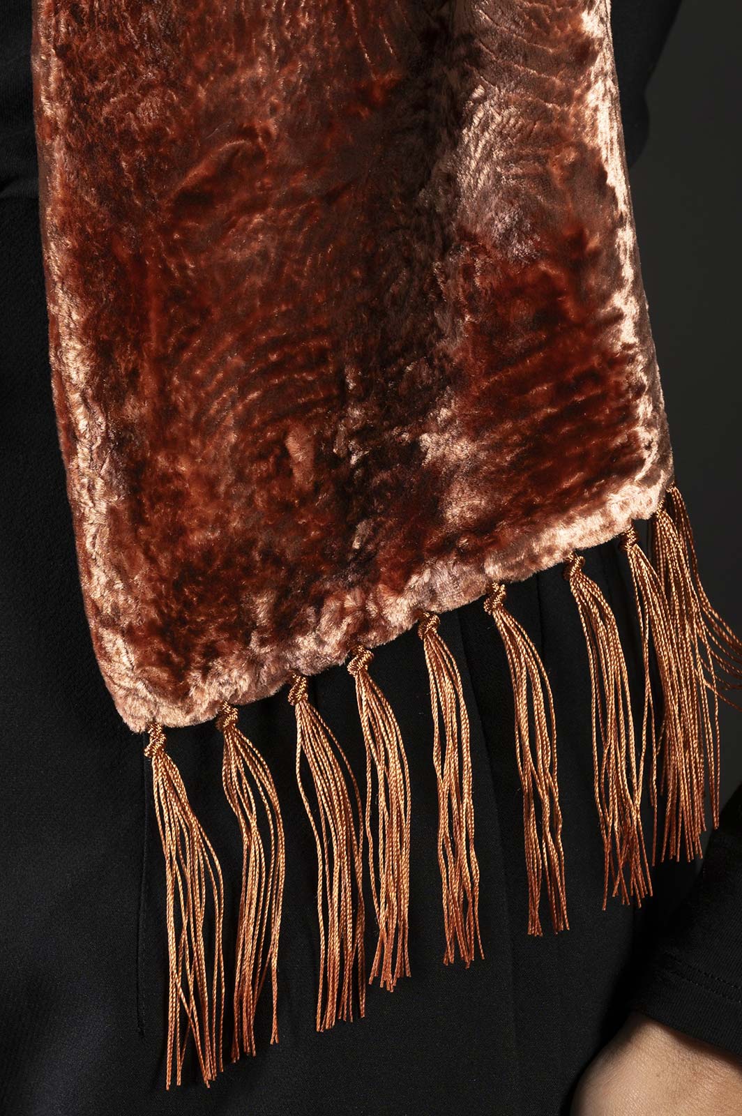 This rust furrowed velvet scarf is based on Mariano Fortuny’s style and techniques.