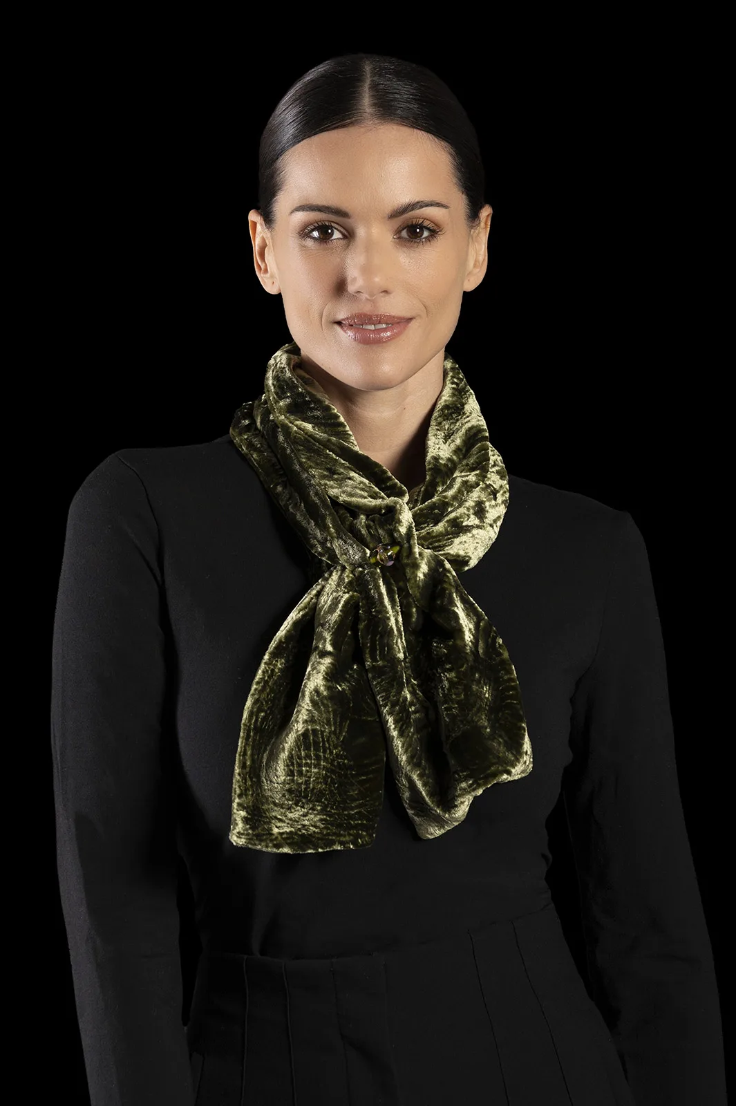 Furrowed velvet scarf with Murano glass beads | Olive green