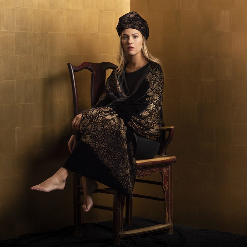 This furrowed velvet shawl is based on Mariano Fortuny’s style and techniques