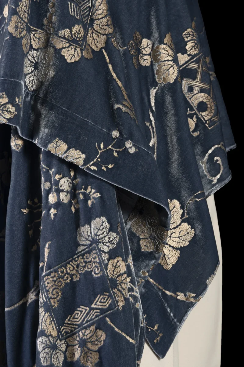 This furrowed velvet shawl is based on Mariano Fortuny’s style and techniques