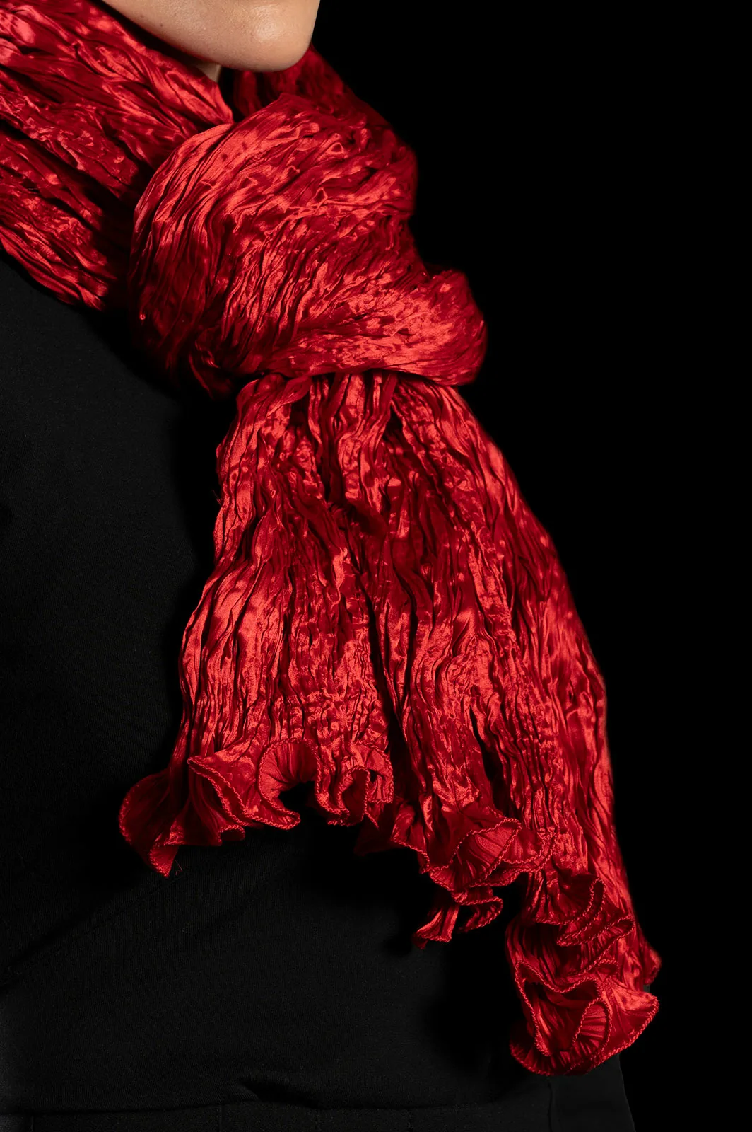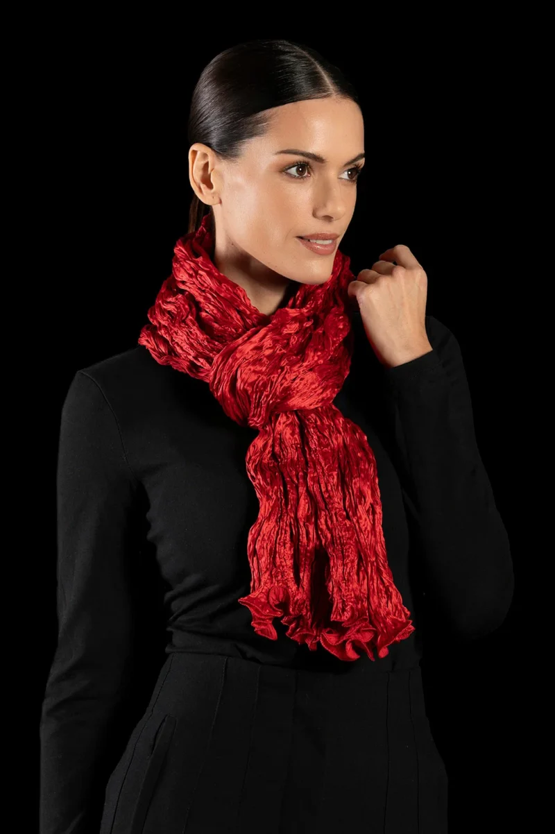 The front of this crinkled crepe satin red silk scarf has a distinctive sheen, which contrasts with the matte finish on the back.