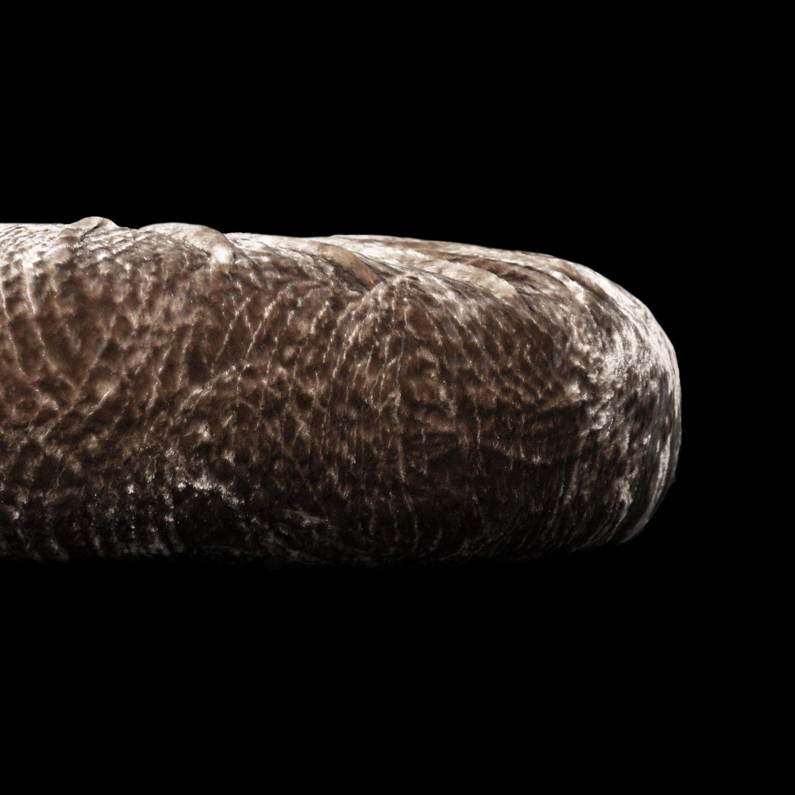 Este cojín de terciopelo con surcos redondeados tiene un diámetro de 40 cm, tejido de terciopelo de seda y relleno de oca 100% natural.